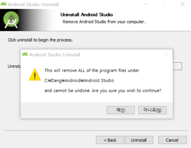 * 사용자 디렉토리에 저장된, 안드로이드 스튜디오 파일을 삭제함