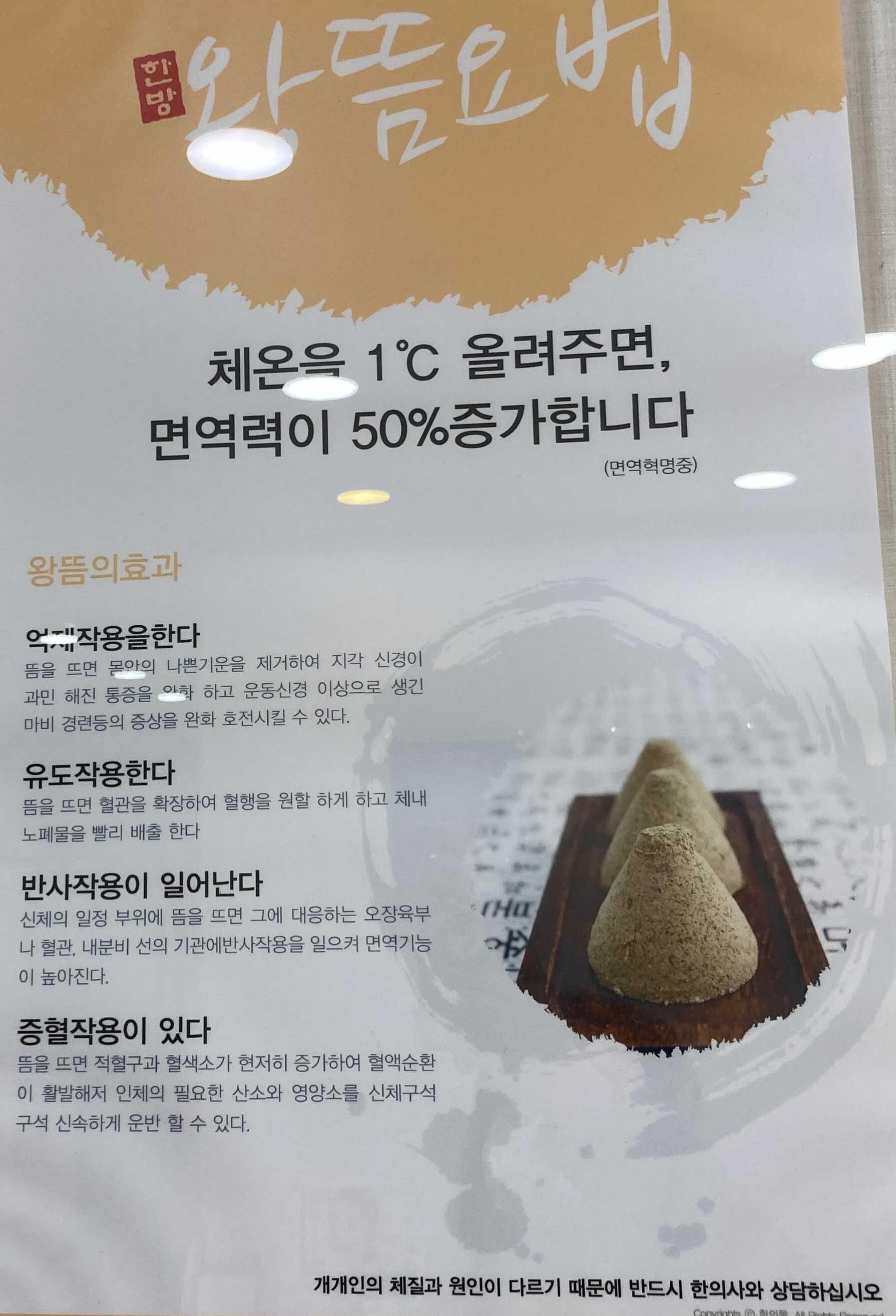 처음 한의원에 가면 배드위에 찜질팩 하나 깔아주시고, 위에 큰~ 수건을 덮어 주시고, 위에 찜질패 하나를 더 올려주신다. 그리고 물리치료와 침 치료를 받고, 등에 찜질팩을 따뜻한 것으로 다시 바꾸어 주시고, 치료 받은 부위에 따라 찜질팩을 해주시고 왕뜸이 올려지면 따뜻한 왕뜸 시간 완성이 된다. 나는 체질 적으로 땀이 없는데, 넉넉한 찜질팩과 따뜻한 왕뜸이 만나면 온몸에 촉촉하게 땀이 올라오고 몸이 따뜻해진다.
