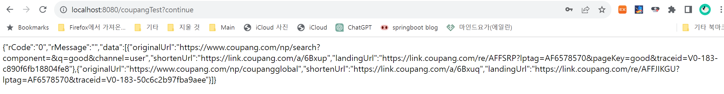 * 쿠팡 파트너스에 있는 예제 코드를 /coupangTest 를 호출 했을때 reponse 되도록 수정함