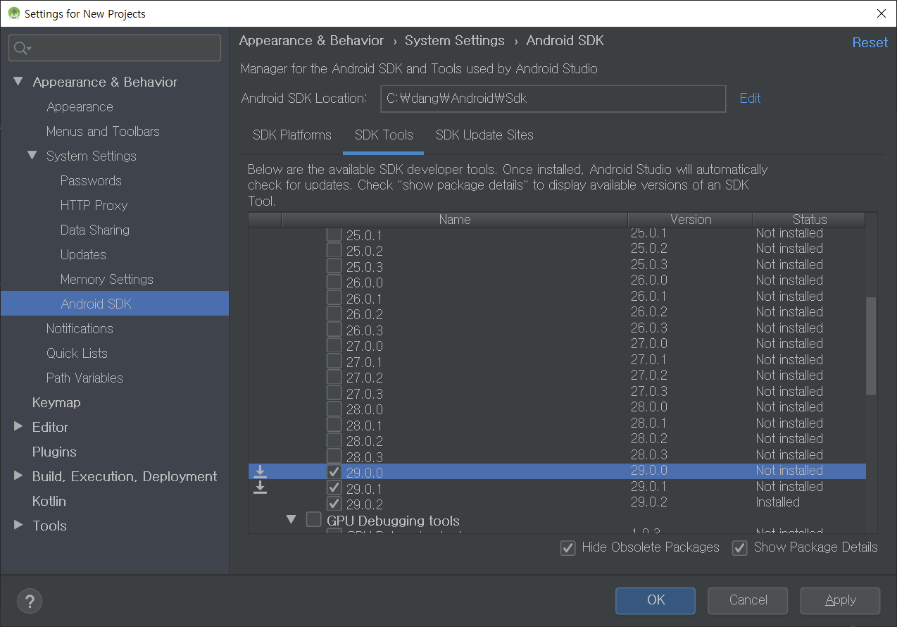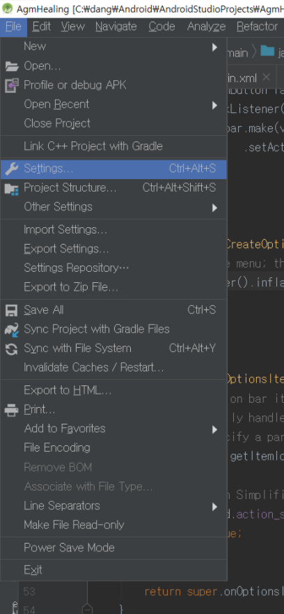 안드로이드 스튜디오 Settings 메뉴에서