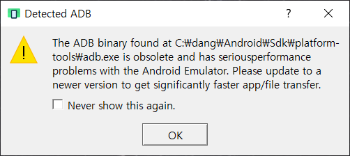 The ADB binary found at C:\dang\Android\Sdk\platform-tools\adb.exe is obsolete and has seriousperformance problems with the Android Emulator.Please update to anewer version to get significantly faster app/file transfer.