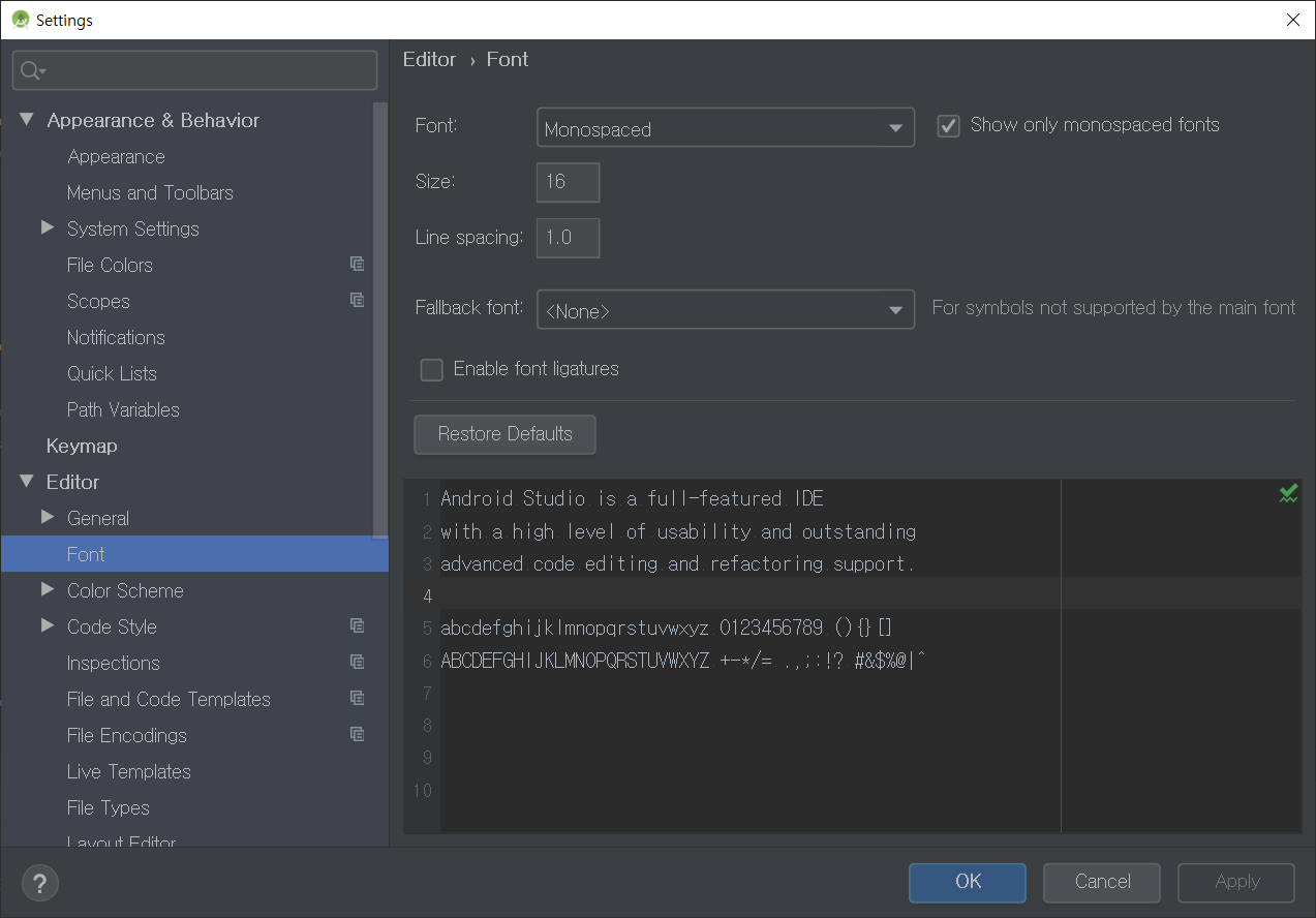 Editor > Font 에서 폰트를 맘에 드는 걸로 정하고