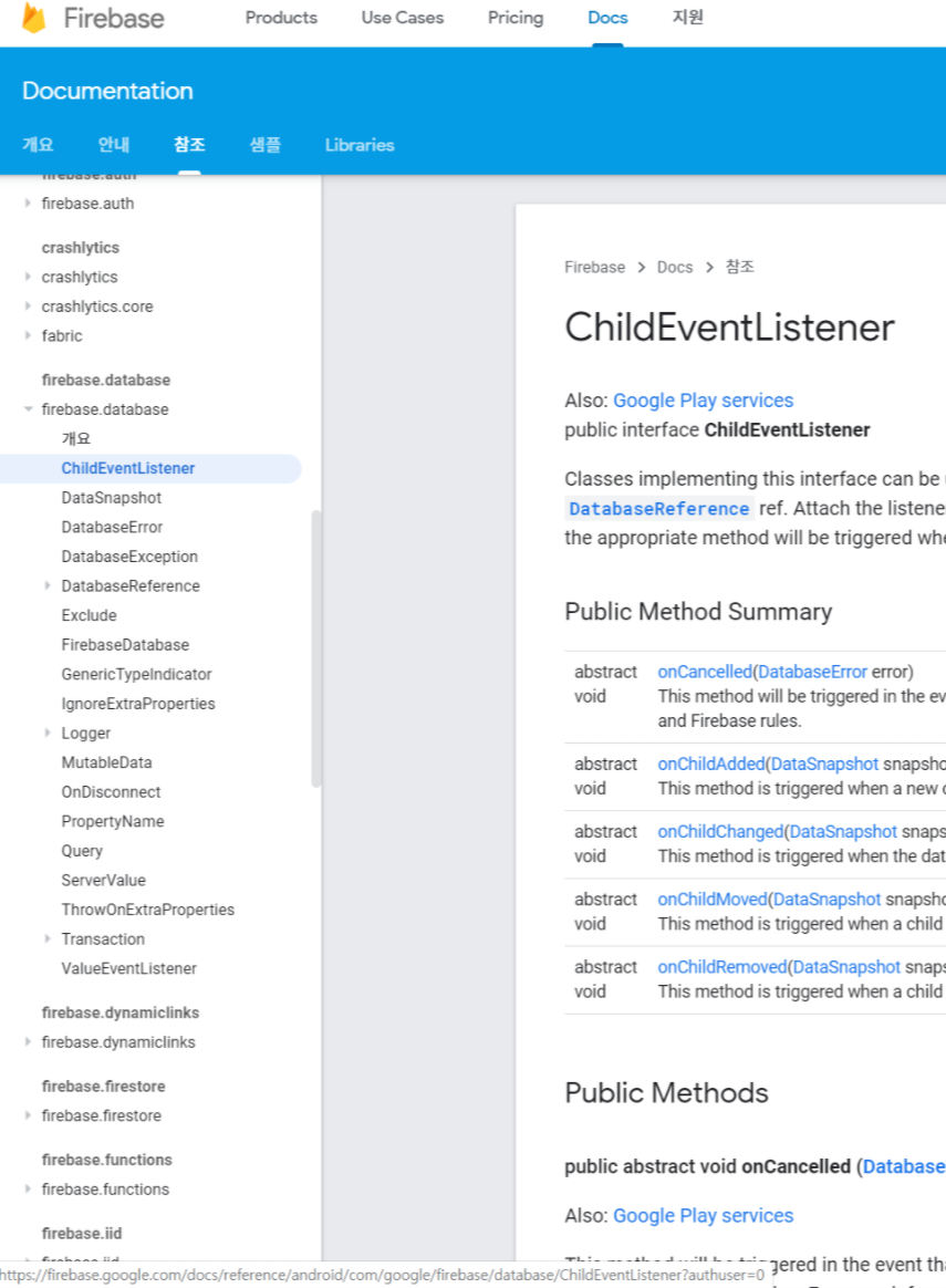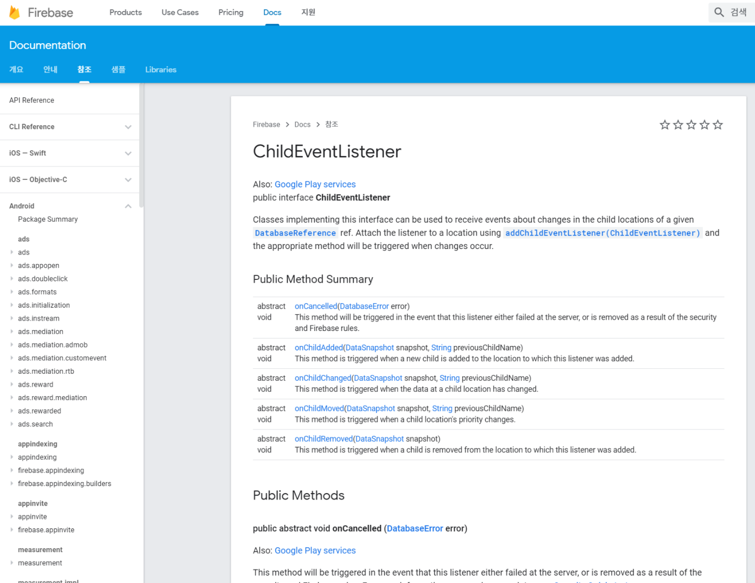 | myRef.addChildEventListener(new ChildEventListener(){ @Override public void onChildAdded(@NonNull DataSnapshot dataSnapshot, @Nullable String s) { } @Override public void onChildChanged(@NonNull DataSnapshot dataSnapshot, @Nullable String s) { for( ItemData oneData: al){ ItemData tempData = dataSnapshot.getValue(ItemData.class); if( oneData.idx.equals( tempData.idx ) ){ oneData.reg_user = tempData.reg_user; oneData.profile = tempData.profile; oneData.title = tempData.title; oneData.image = tempData.image; oneData.summary = tempData.summary; oneData.heart = tempData.heart; oneData.reply = tempData.reply; oneData.more = tempData.more; oneData.count = tempData.count; oneData.reg_date = tempData.reg_date; } } adapter.notifyDataSetChanged(); } @Override public void onChildRemoved(@NonNull DataSnapshot dataSnapshot) { } @Override public void onChildMoved(@NonNull DataSnapshot dataSnapshot, @Nullable String s) { } @Override public void onCancelled(@NonNull DatabaseError databaseError) { } }); |