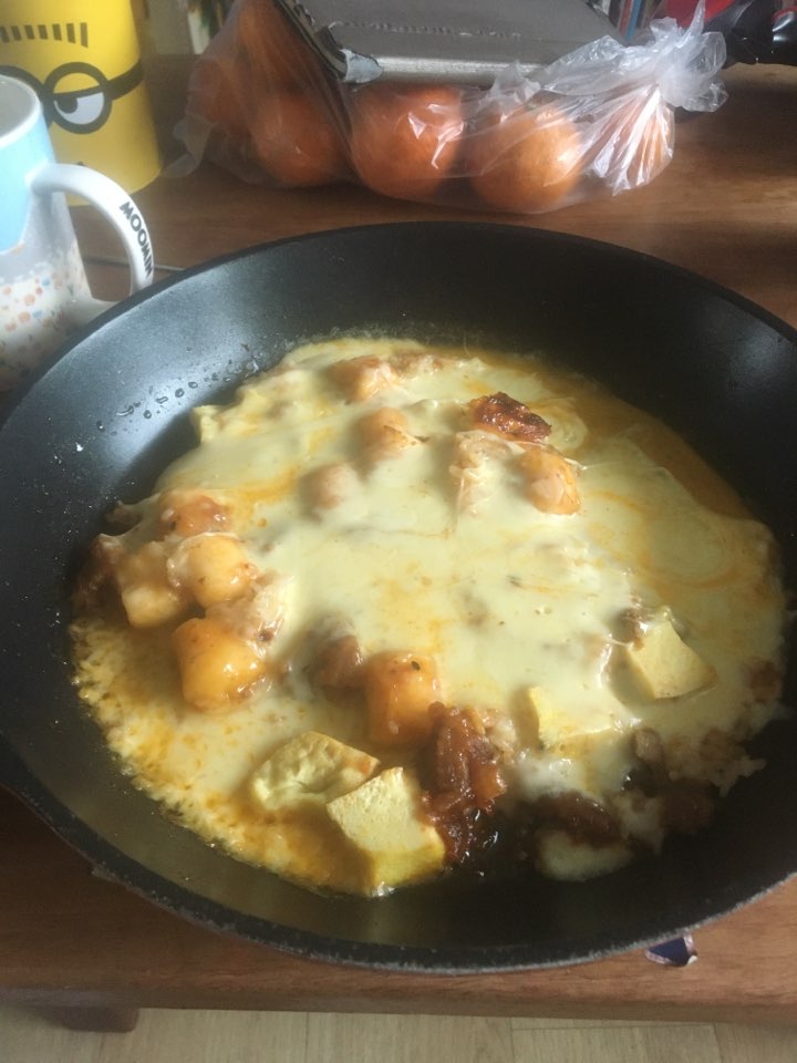 애들 아침 먹이고 남은 밥에 닭강정 남은 것 넘고 볶아 치즈를 듬뿍!