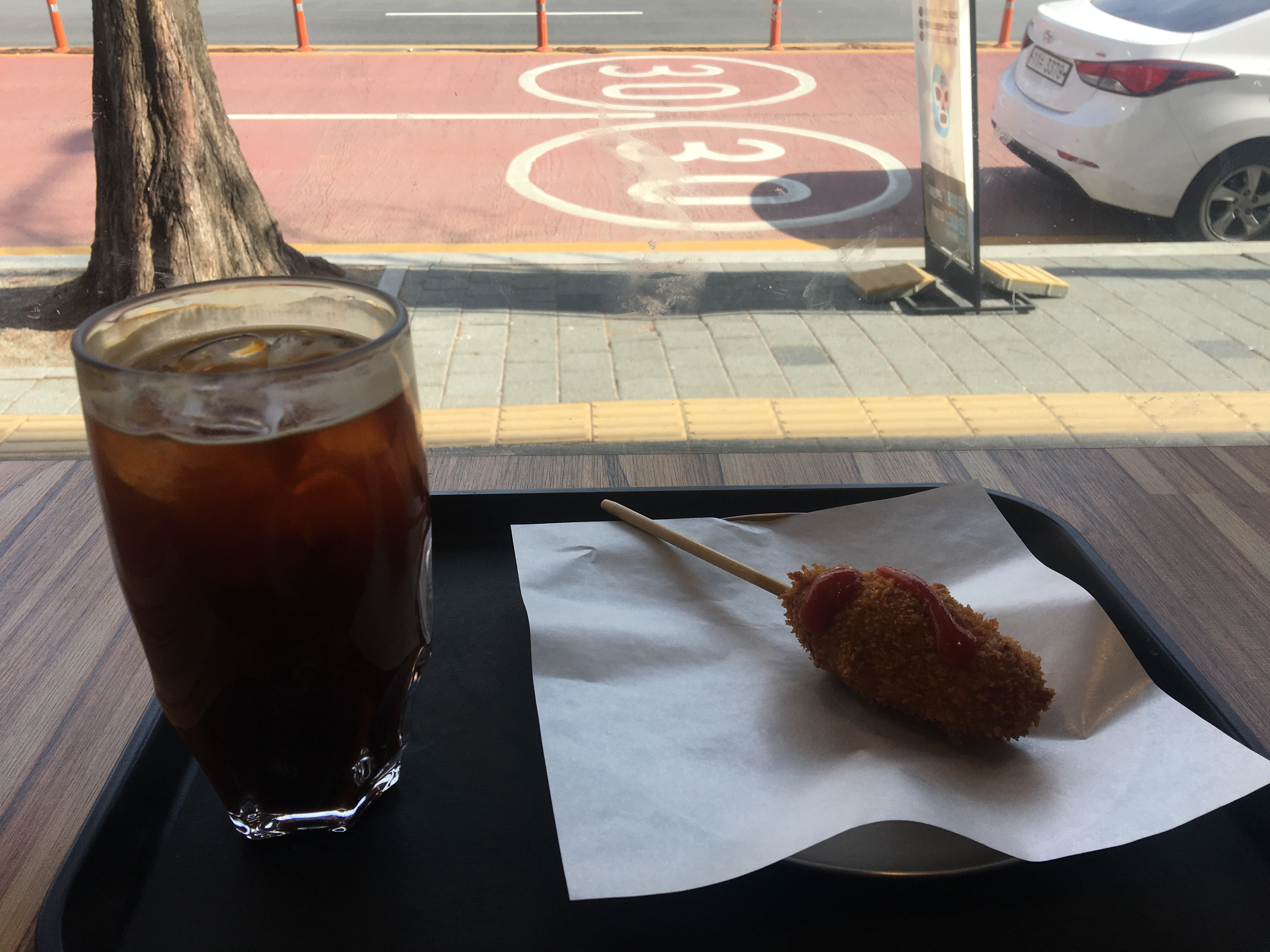 핫도그 집에서 핫도그랑 아이스 아메리카노 먹는 중
